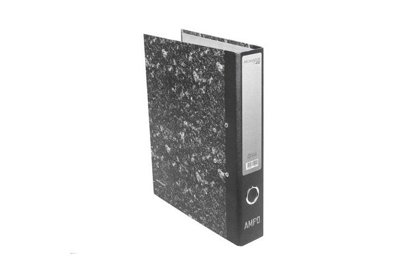 Archivador de cartón tamaño carta A4 lomo delgado modelo t-432 (4 centímetros de lomo y 32 centímetros de alto), con mecanismo de dos argollas, diseño marmoleado, incluye prensa documentos. Marca AMPO.