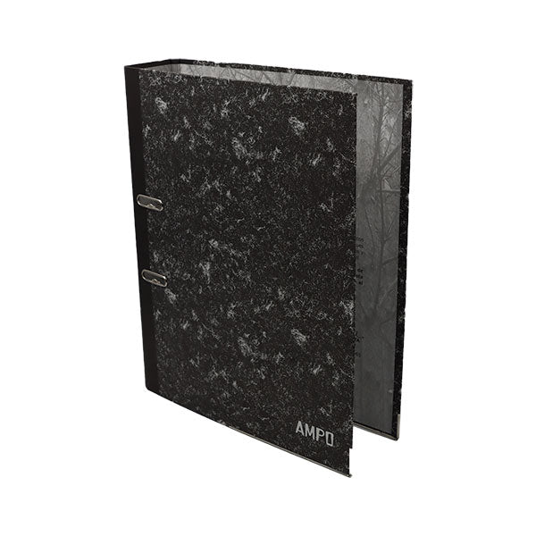 Archivador de cartón tamaño oficio, modelo t-835 (8 centímetros de lomo y 35 centímetros de alto), con mecanismo de dos argollas, diseño marmoleado con rados, protector de borde y prensa documentos. Marca AMPO.