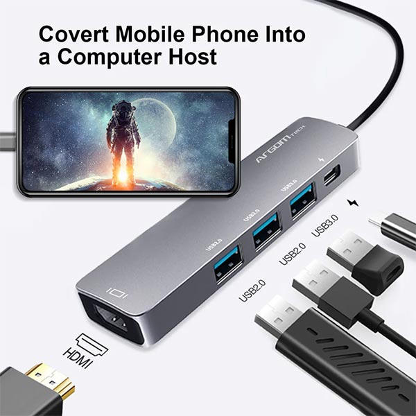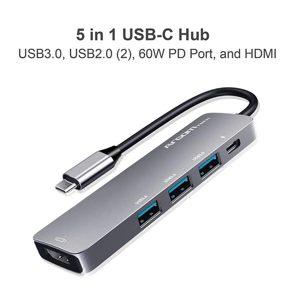 Amplíe las opciones de puerto de su computadora o teléfono móvil con nuestro concentrador tipo C 5 en 1. El One Axess 5 en 1 le permite conectar un monitor externo (HDMI), una unidad de memoria USB u otros periféricos USB (USB 3.0 o USB 2.0). Este concentrador también está equipado con un puerto de carga de paso PD de hasta 60 W. ¡Simplemente inserte el concentrador en un puerto de dispositivo compatible con Tipo C/PD y disfrute!