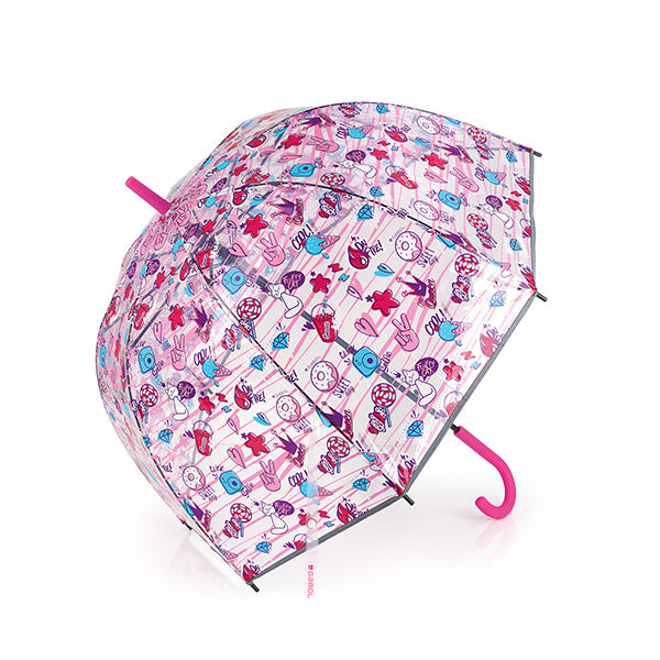 Sombrilla larga transparente Gabol, colección Sticker reflectante: diseño moderno y práctico con detalles reflectantes. Ideal para días lluviosos, combinando estilo y funcionalidad.