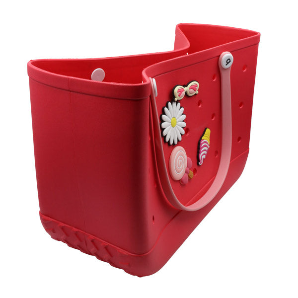 Llevá el verano con vos con este bolso coral de estilo playero, ideal para la playa, piscina, paseos o salidas casuales. Incluye 4 pines decorativos (lollipop, lentes, flor y cono helado) que le dan un toque divertido. Espacioso y práctico, mide 47x32x23 cm para que no te falte nada en tus aventuras.