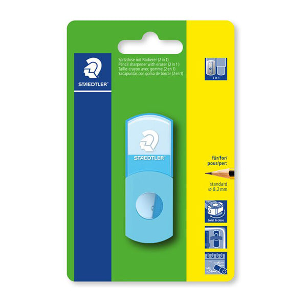 Práctico set en blíster que incluye un tajador para lápices de grafito de tamaño estándar y un borrador con tapa protectora. Ideal para estudiantes y profesionales que buscan comodidad y precisión en un solo accesorio.
