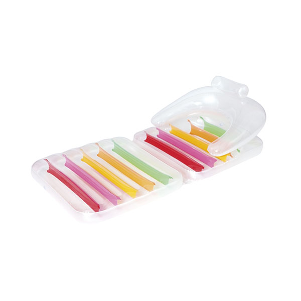 Salón inflable para piscina, diseñado para brindar máximo confort, soporte y versatilidad. Su práctico diseño plegable permite transformarlo en una cómoda silla para uso dentro o fuera del agua en cuestión de segundos. La superficie superior transparente con haces de aire en colores brillantes proporciona un estilo moderno y un soporte ergonómico, mientras que el respaldo, reposacabezas y reposabrazos inflados garantizan una experiencia de descanso superior.