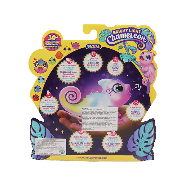 "¡Descubre el mundo de Little Live Pets con Sunny the Bright Light Chameleon! Sunny es un camaleón interactivo y luminoso con más de 30 sonidos y emociones diferentes. Este camaleón suave y tierno se ilumina de verde cuando está feliz, se pone rojo cuando está enojado, azul cuando está triste y mucho más. Incluso canta y brilla con luces de arco iris cuando está súper contento. Puedes interactuar con Sunny acariciándolo, alimentándolo y hablándole. Sus pies con ventosas te permiten llevarlo a todas partes, y cuando reproduces música, Sunny se ilumina al ritmo de la canción. Sunny the Bright Light Chameleon está lleno de diversión y personalidad, ¡y las baterías están incluidas para que pueda empezar a jugar de inmediato! Apto para niños a partir de 5 años."