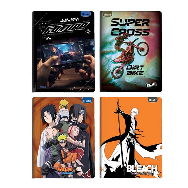 Contiene 100 hojas de 19x24 cm, ideal para tareas y notas escolares. Producto surtido con portadas variadas de la colección Mix Hombre, enviadas al azar. Perfecto para quienes buscan funcionalidad con un diseño masculino y moderno.