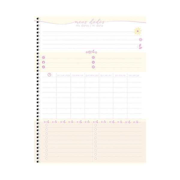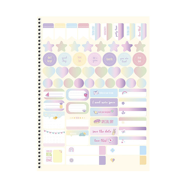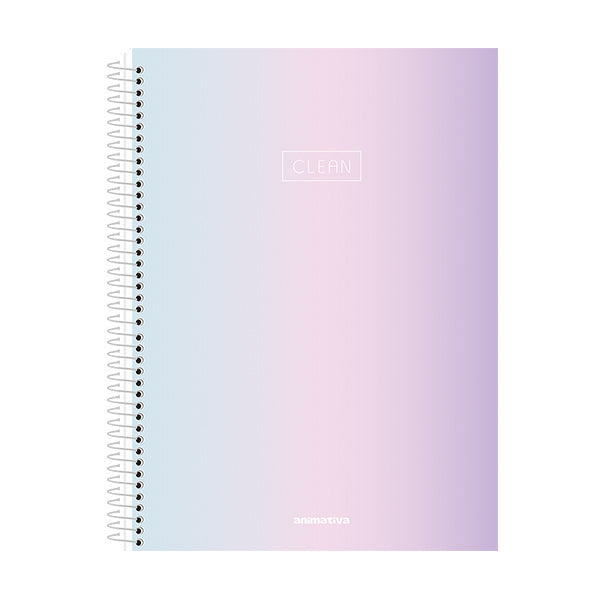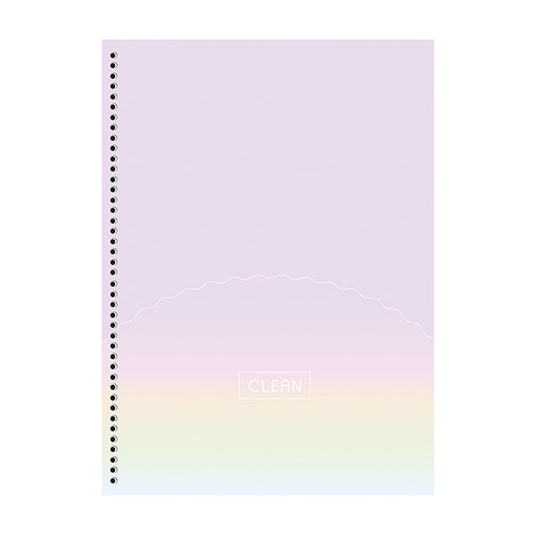 El cuaderno de resortes Clean tiene una tapa dura y contiene 160 hojas. Su diseño presenta colores armónicos inspirados en la paleta de colores pastel, con toques delicados que destacan en la colección. Viene con stickers y una bolsa de papel porta documentos para mayor practicidad.
