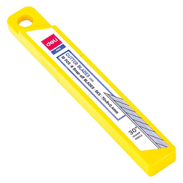 Hoja de acero duradera. - Combina el Deli E2034. - Paquete de caja PP portátil (10 piezas / caja) - Punta de cuchilla de 30 grados para un corte más nítido y fácil. - Hoja de acero SK5 dura para un corte fácil y un uso duradero.