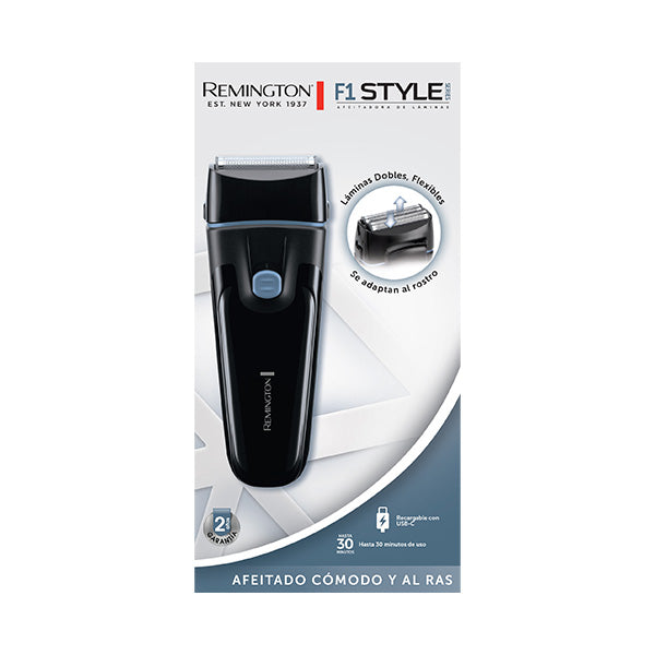 Afeitadora de Láminas Remington Style Series F1, F1001A: Disfruta de un afeitado apurado y cómodo con cuchillas de acero inoxidable y hojas flexibles. Con 30 minutos de uso continuo tras 8 horas de carga, diseño USB-C y cortador de patillas plegable, es ideal para el cuidado personal en cualquier lugar. Cuchillas extraíbles y lavables para un mantenimiento fácil. Incluye cepillo limpiador y 1 año de garantía.