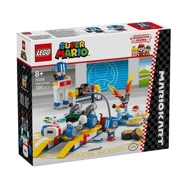 Tu peque se convierte en un mecánico más del garaje de Toad y pone a punto el Rayo GTI con este juego de juguetes personalizable LEGO® Super Mario™: Mario Kart™ (72035). El set, una fantástica idea de regalo con personajes de Nintendo® para niños,niñas y jugadores a partir de 8 años, incluye 2 figuras de juguete de Toads Azules con uniforme de boxes azul, una plataforma elevadora de vehículos que funciona, neumáticos normales o neumáticos normales azules para elegir, y herramientas. El Rayo GTI tiene un lanzacaparazones y se le pueden acoplar el claxon y el motor de las máquinas de personalización. Agrega una figura de LEGO® Mario™, LEGO® Luigi™ o LEGO® Peach™ (de los sets 71439, 71440 o 71441, a la venta por separado) para jugar de forma interactiva y provocar reacciones digitales al conducir, derrapar y flotar en el Rayo GTI, y selecciona los sonidos del claxon y el motor en las máquinas de personalización.
