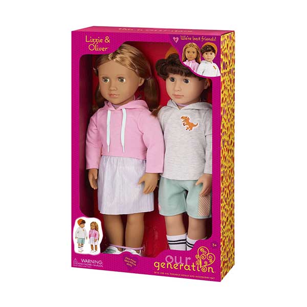Duplica la diversión y la amistad con Lizzie y Oliver, el encantador dúo de muñecos Our Generation de 46cm, diseñados para compartir aventuras inolvidables. Cada uno viste su propio estilo: Lizzie luce una falda colorida y suéter con capucha, mientras Oliver lleva pantalones cortos, gorro y un suéter a juego, ideales para crear looks modernos y personalizados. Ambos tienen cuerpos suaves y abrazables, ojos expresivos que se abren y cierran, y cabellos peinables —Lizzie con mechones rubios oscuros y Oliver con cabello castaño ondulado— que inspiran horas de peinados creativos. Con ropa de cierres fáciles, este set permite mezclar y combinar prendas, fomentando la autoexpresión, la imaginación y el juego de roles en niños desde los 3 años.