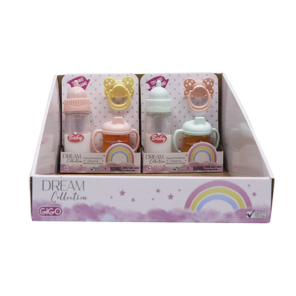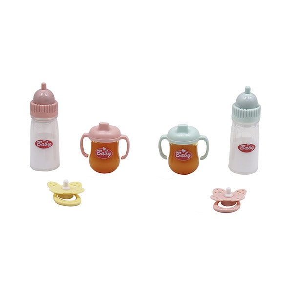 Set con muñeca que incluye biberón mágico con sonido, vaso de jugo mágico y chupete. Requiere 2 baterías AG13 (incluidas). Disponible en 2 modelos, se venden por separado (código surtido). Recomendada para mayores de 3 años.