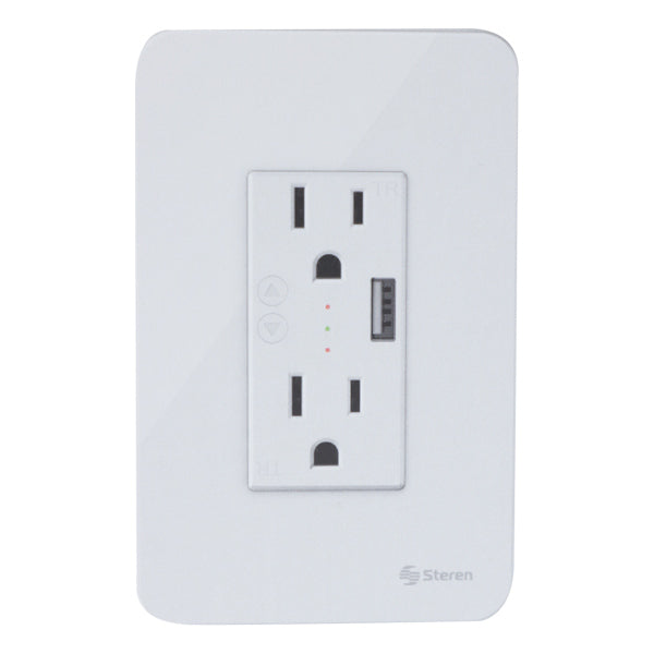 Cargador USB: Incorpora una salida USB de 2 A para recargar la batería de dispositivos como celulares, tablets y otros, a velocidad express. El control del cargador es por Wi-Fi y se realiza de manera independiente de los contactos.