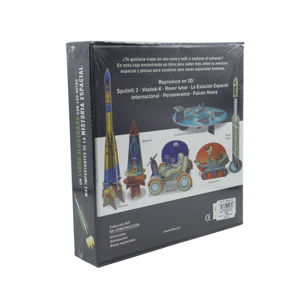 "¡Prepárate para explorar el universo con esta emocionante caja! Incluye un libro para aprender sobre la aventura espacial y piezas para construir seis naves espaciales famosas: Sputnik II, Vostok K, Rover Lunar, la Estación Espacial Internacional, Perseverance y Falcon Heavy."