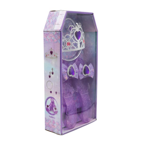 "Estimula la creatividad y habilidades prácticas con este set de accesorios para princesas en morado. Incluye tiara, zapatos, aretes, collar y anillo. Apto para niños y niñas mayores de 3 años."