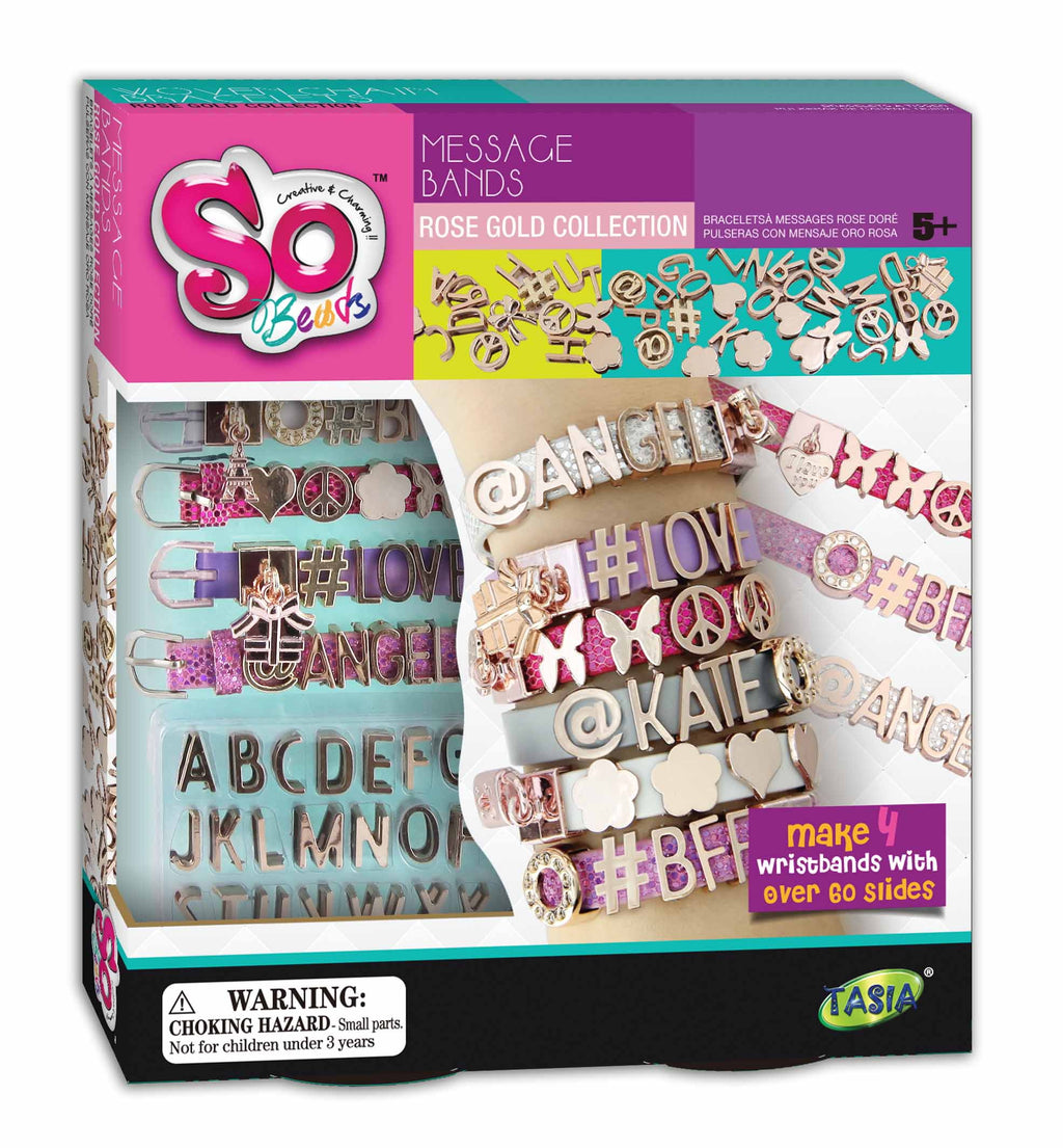 Set de juguete de bisutería, brazaletes mensajes oro rosa. Marca Tasia. Diseño único, no es un surtido. Edad recomendada para uso 5+