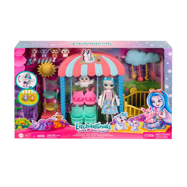 Los sets de muñecas Enchantimals™ celebran el grupo de amigas adorables que comparten un vínculo especial con sus mejores amigos animalitos. Las niñas pueden jugar todo el día con Enchantimals Baby Best Friends™ en el set de juego Darling Daycare™, que incluye a la muñeca Starley Stork™. Su figura de mejor amigo animalito Bouncer y otros cuatro amigos animales revoltosos pueden jugar en el set de columpio, en una silla alta doble, en un árbol de gato y mucho más. Cuando sea la hora de la siesta, pasa una pata por el móvil y ve a los mejores amigos animalitos tomar una siesta en la cuna. Nunca hay momentos aburridos en Darling DayCare™. Los colores y las decoraciones pueden variar.