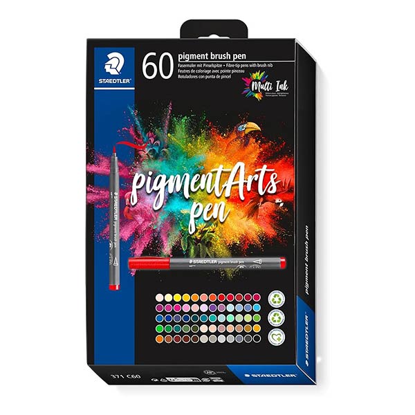 Marcadores de alta calidad, con punta de pincel, permanente y resistente al agua, se puede pintar sin manchas, secado rápido en todas las superficies, la tinta no traspasa el papel, contiene 60 unidades, colores surtidos. Marca Staedtler.