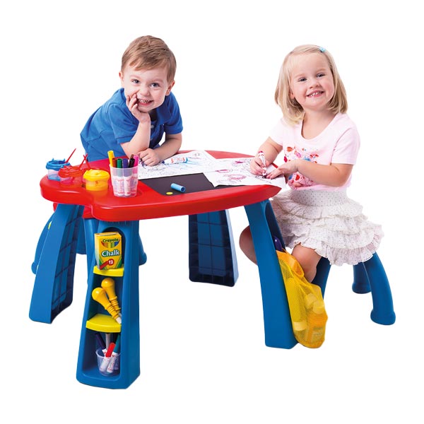 Estación de creatividad con almacenamiento de 360 ??grados. Superficie de pizarra grande y tradicional para una creatividad infinita. Incluye 2 taburetes, 3 vasos de pintura, 3 pinceles, bolsillo de tela, 1 borrador