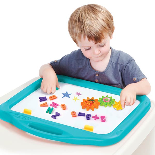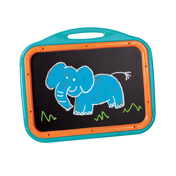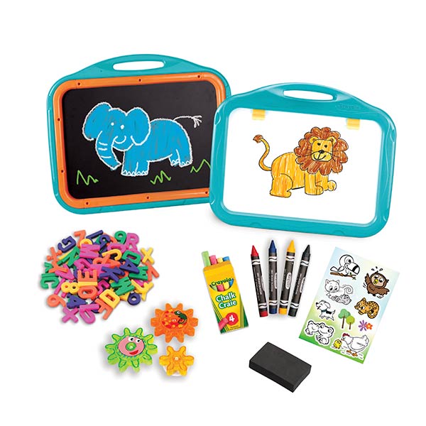 Pizarra magnética de borrado en seco de doble cara/caballete portátil de pizarra. Incluye: 77 piezas de letras y números magnéticos, tizas de colores Crayola® de 4 unidades, 1 hoja de calcomanías, crayones de borrado en seco Crayola® de 4 unidades, borrador, 3 engranajes magnéticos con función prueba. Medidas: 48 x 3,8 x 40 cm