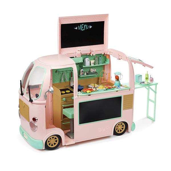 ¡Lleva el sabor a todas partes con el Food Truck en Movimiento de Our Generation! Este increíble vehículo rosa para muñecas de 46cm está cargado con más de 50 accesorios realistas, incluyendo mariscos detallados, frutas frescas, batidos, utensilios, platos y hasta dinero y terminal de pago de juguete. Perfecto para los pequeños chefs, cuenta con pizarra funcional para escribir menús, horno y parrilla con perillas giratorias, estación de batidos y un mostrador para preparar pedidos.