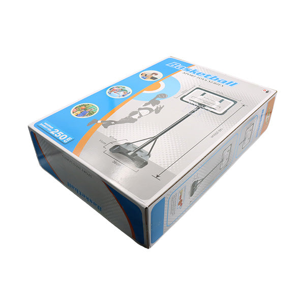 Set de basketball con base, altura ajustable 148cm a 250cm. Incluye 1 balón de basketball, 1 herramienta, 1 net y 1 inflador de balón. No requiere baterías para su uso. Edad recomendada 6+ años.