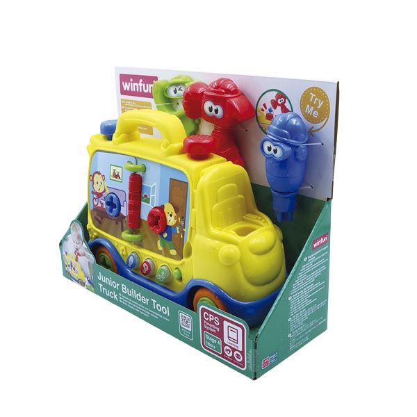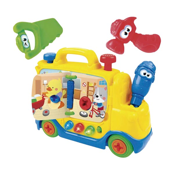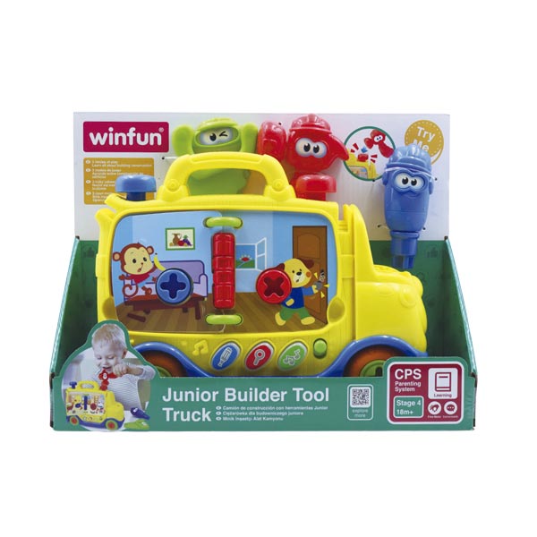 Diviértete con tu pequeño con el camión de construcción con herramientas junior. Este juguete para bebé es interactivo, cuenta con botones luminosos y alegres melodías para estimular el sistema sensorial (vista, tacto, oído), sus tres (3) modos de juego: sonidos de animales, efectos de sonido y modo de música mantendrán a tu bebé entretenido. Levanta las clavijas con el martillo, gira el destornillador para escuchar sonidos de clic clac y corta con la sierra en los espacios de ranura, incluye dos (2) páginas coloridas giratorias con efecto de sonido, equipado con herramientas: martillo, sierra y destornillador para tu diversión y la de pequeño. Acompaña cada etapa de crecimiento y desarrollo de tu bebé con juguetes Winfun. Funciona con 2 baterías AAA incluidas. Edad recomendada 18m+.