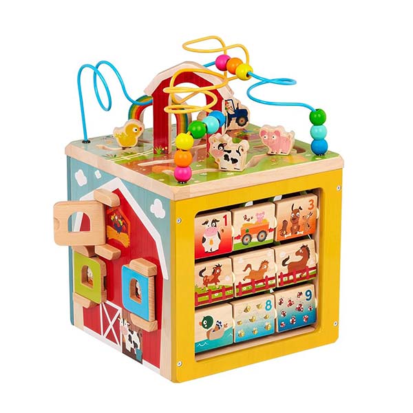 Explora la vida en la granja con este cubo de actividades de madera de 5 caras. Incluye un laberinto de cuentas en la parte superior, personajes granjeros (cerdo, gallina, vaca) y un remolque para empujar. Cada lado presenta actividades diferentes: puertas de “peek-a-boo”, engranajes, piezas para encajar y caminos zig-zag. Ideal para niños desde 12 meses, promueve el desarrollo motor y cognitivo mientras se divierten todo el día.