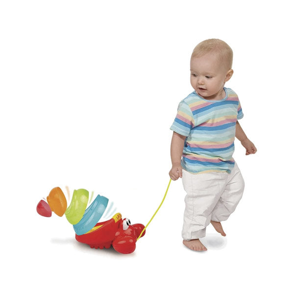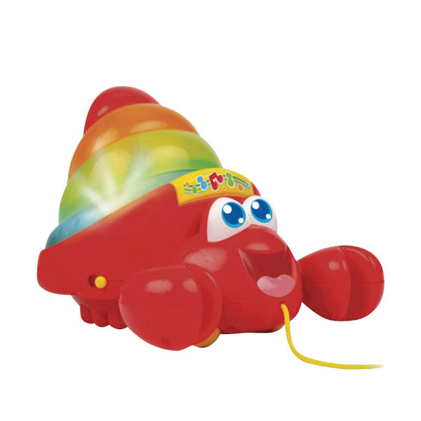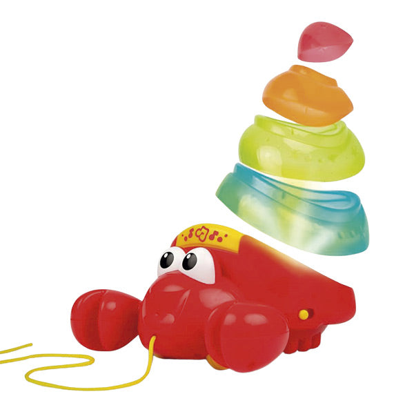 "Pirámide musical de cangrejos para arrastrar, tiene 4 anillos iluminados para apilar. El cangrejo expulsa sus anillos para una divertida sorpresa.