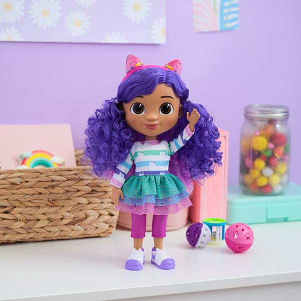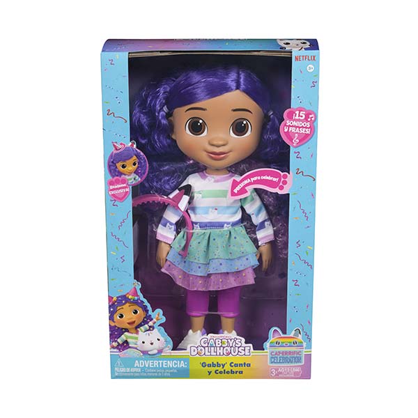 ¡Cantá, jugá y celebrá con Gabby! Con su look festivo y su corona mágica giratoria que revela orejas de gatita y de fiesta, esta muñeca es perfecta para recrear momentos especiales de la serie. Ideal para estimular la imaginación y vivir horas de diversión junto a tu personaje favorito.