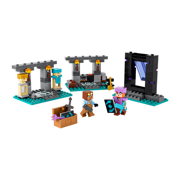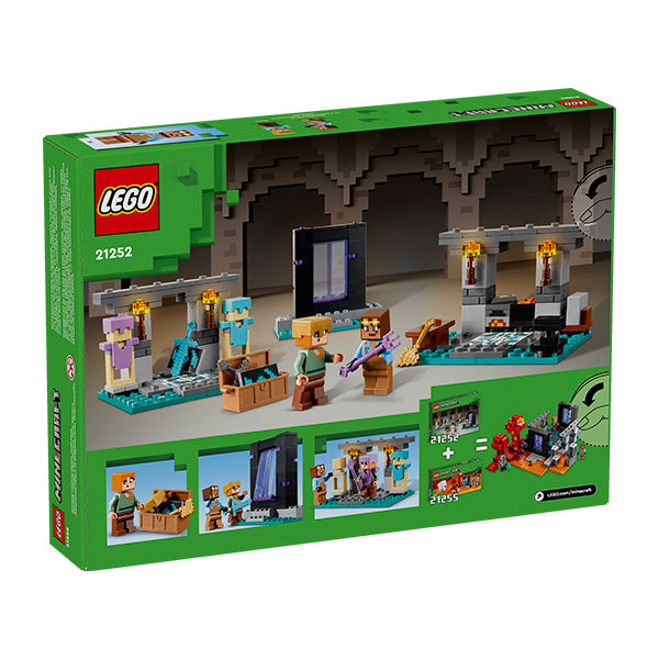 El set La Armería (21252) es un kit de construcción LEGO Minecraft diseñado para jugadores de Minecraft de 7 años o más. Este set ofrece a los niños y niñas la oportunidad de jugar en el mundo real con elementos y armas de Minecraft. Incluye dos figuras: la heroína de acción Minecraft Alex, con su escudo y espada de diamante, y el armero. El set consta de tres entornos diferentes para explorar: la zona de trabajo, que incluye un yunque, un horno, una piedra de afilar y un caldero lleno de lava; la sala de exhibición de armaduras, donde encontrarás un hacha dorada, un tridente encantado, una espada de netherita, un casco y otros recursos de Minecraft; y el portal del Nether, con una entrada de puertas batientes que lleva a una nueva aventura para los jugadores. Este juguete LEGO Minecraft se puede combinar con otros sets LEGO Minecraft, como La Trampa del Portal del Nether (21255), que se venden por separado, para expandir y enriquecer la experiencia de juego en el mundo de Minecraft.