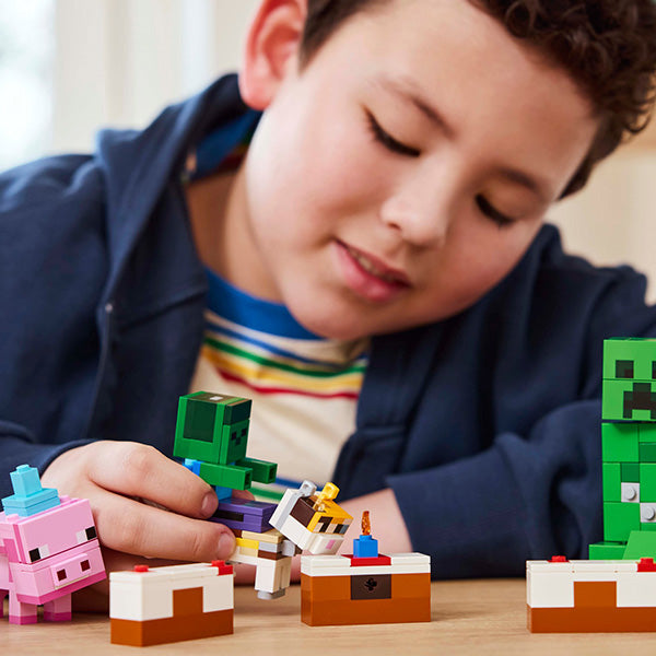 El set LEGO® Minecraft Fiesta de Cumpleaños del Cerdo Bebé (21281) es el regalo perfecto para fans de Minecraft®. Este set inspirado en el videojuego está lleno de figuras y diversión festiva, ideal para cumpleaños o sorpresas. Incluye una figura de Creeper™ con piernas móviles y un compartimento para pólvora, además de un zombie bebé, un zorro bebé, un gato bebé y una llama bebé, todos con partes móviles. Completa la fiesta con un pastel que puedes dividir en 3 partes. ¡Una celebración de Minecraft® en cada construcción!