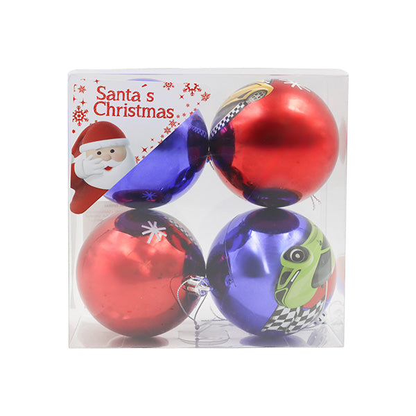 Esferas de Navidad de 8 cm con diseño de carros, en caja de 4 unidades. Cada esfera incluye una tapa y una cuerda, facilitando su colgado en las puntas del árbol. Solo saca las esferas y cuélgalas para una decoración instantánea y divertida. Perfectas para añadir un toque encantador y festivo a tu árbol de Navidad.