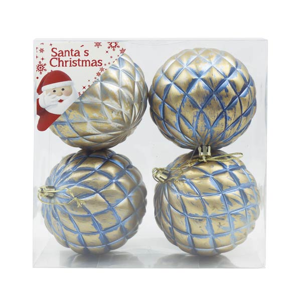 Esferas de Navidad doradas de 10 cm en caja de 4 unidades. Cada esfera incluye una tapa y una cuerda, facilitando su colgado en las puntas del árbol. Solo saca las esferas y cuélgalas para una decoración instantánea y elegante. Perfectas para añadir un toque brillante y festivo a tu árbol de Navidad.