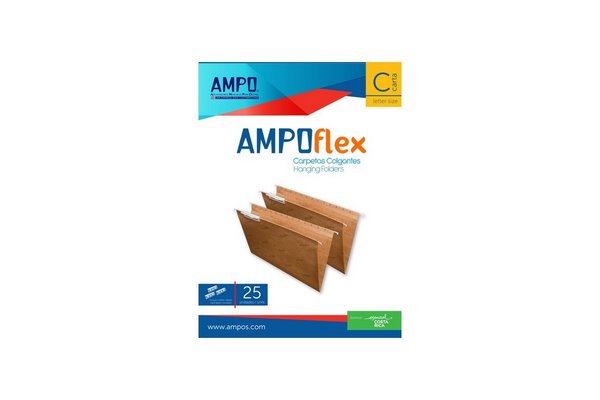 Carpeta colgante tamaño carta. Confeccionada en carton kraft color café. Caja con 25 unidades. Marca AMPO.