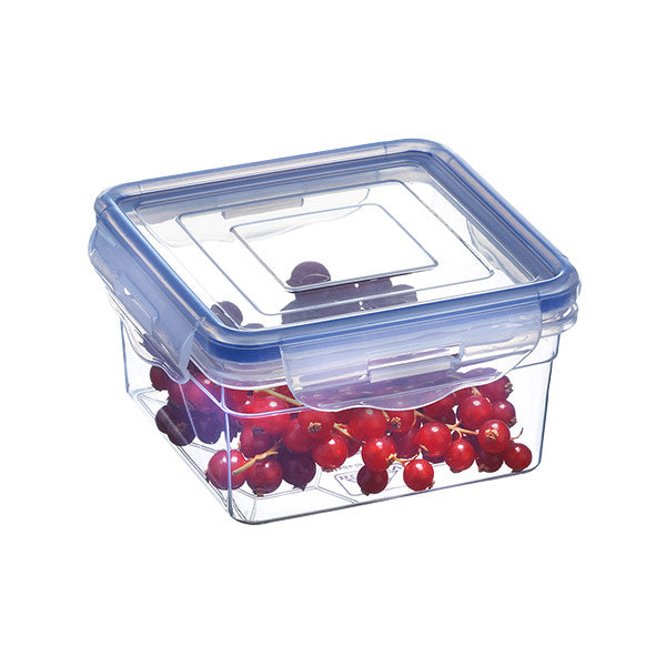Material: plástico. Color: transparente y azul. Capacidad: 1,2 litros. Medidas: 16x16x8cm. Este contenedor cuenta con un cierre hermético antiderrames. Es apilable.