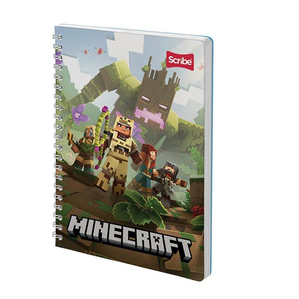 Cuaderno Scribe con espiral doble argolla y rayado, inspirado en diseños de Minecraft. Incluye 100 hojas, una hoja de stickers y contraportadas impresas. Nota: producto surtido, recibirá una de las portadas disponibles.