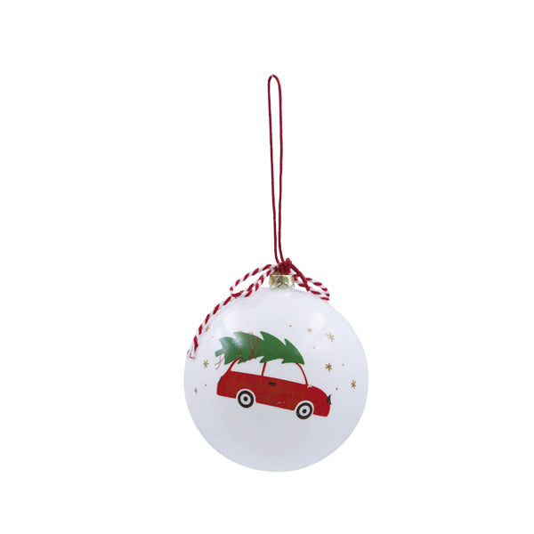 Perfecto para navidad cuenta con una tapa y una cuerda para colgarla fácilmente tu árbol de navidad para decorar. Ajuste perfecto para cualquier árbol de tamaño normal. Esferas para árbol con peso ligero que no doblan las ramas del árbol de navidad. Diseño de camión. Color blanco. Tamaño 8cm