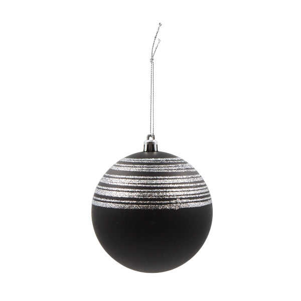 Esferas de Navidad negras de 10 cm, diseño corrugado. Cada esfera incluye una tapa y una cuerda, facilitando su colgado en las puntas del árbol. Solo saca las esferas y cuélgalas para una decoración instantánea y sofisticada. Perfectas para añadir un toque elegante y moderno a tu árbol de Navidad.