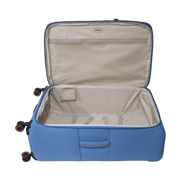 Maleta suave de 28" color celeste, marca Verage. Amplia y resistente, ideal para viajes largos. Diseño moderno, ligero y fácil de transportar con ruedas giratorias.
