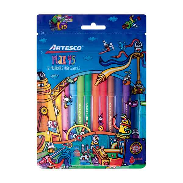 Colores de alta intensidad y brillo, lavables, fácil de retirar de las manos con agua y jabón, tapa con diseño anti-asfixia, blíster con práctico zipper, punta extra resistente para un mejor delineado, materiales no tóxicos.