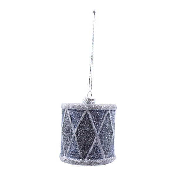 Ornamentos colgantes para árbol de navidad, con cuerda lista para colgar. Diseño de tambor. Color plateado con blanco. Tamaño 6cm.