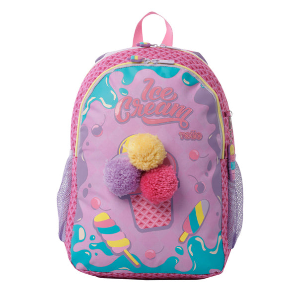 Perfecta para el colegio, esta mochila combina funcionalidad y diversión. Confeccionada en poliéster resistente, cuenta con un amplio compartimento principal con cierre de doble cremallera y correas acolchadas para mayor comodidad. Sus bolsillos laterales son ideales para botellas, y el bolsillo frontal con cremallera mantiene organizados los artículos pequeños. El estampado en puff y el llavero tipo pom pom añaden un toque especial y alegre. ¡Haz que cada día escolar sea único con la Ice Pop L!