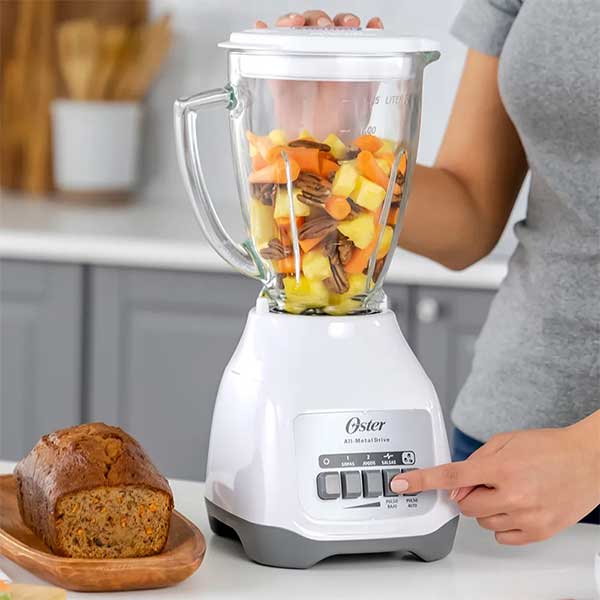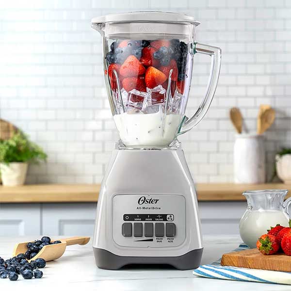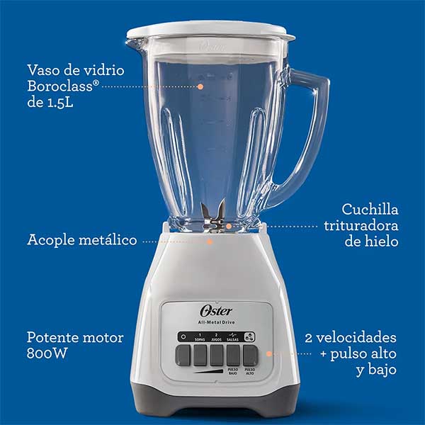 Esta licuadora Oster de dos velocidades más función de pulso y cuchillas potentes de material resistente, te ayudarán a crear deliciosos batidos, jugos o mezclas para consentir a la familia o regalarte a vos un sabroso jugo fresco; tiene un motor de gran capacidad y jarra de vidrio resistente a choque térmico de 90 grados, que te permite procesar alimentos calientes.