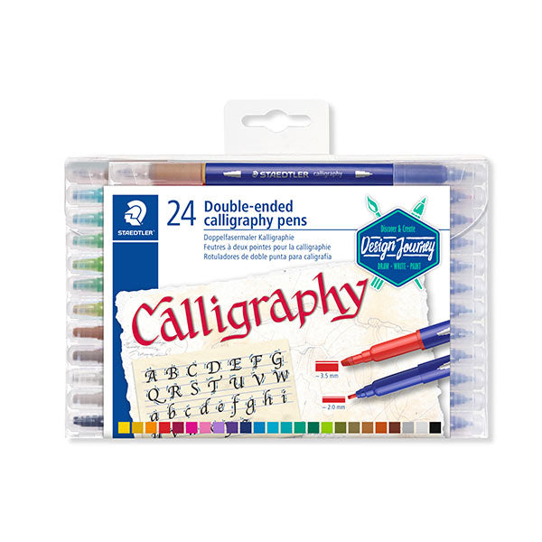 Estuche transparente con 12 rotuladores doble punta para caligrafía en colores surtidos. Un rotulador - dos puntas, fina y grueso. a Para escritura expresiva y diseños decorativos. Anchos de línea ~ 3.5 mm y ~ 2.0 mm.