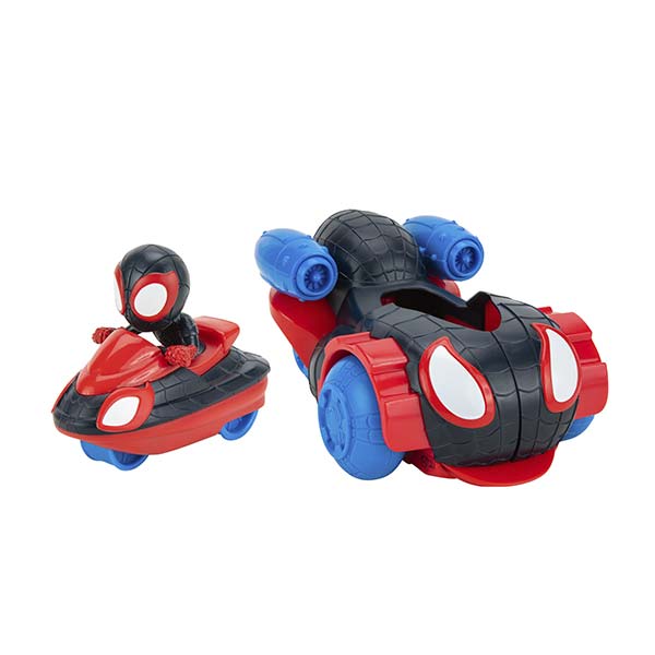 ¡Prepárate para la acción con Miles Morales: Spider-Man y su asombroso vehículo! Con el Techno ATV Racer, comienza la persecución en tierra, ¡y cuando la aventura se mueva al agua, activa el Jetski presionando la cola trasera del Racer! Equipado con ruedas libres, este vehículo puede correr sobre cualquier superficie para salvar el día. ¡No te pierdas esta emocionante aventura con Miles Morales: Spider-Man!