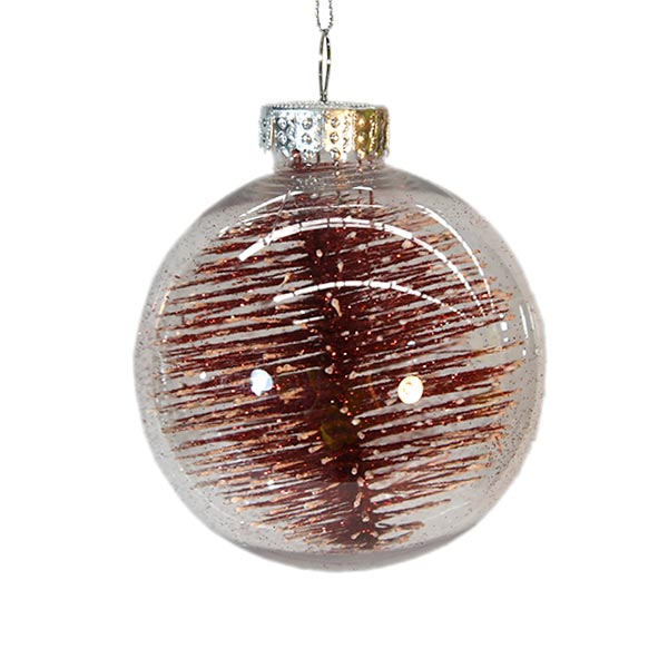Perfecto para navidad cuenta con una tapa y una cuerda para colgarla fácilmente tu árbol de navidad para decorar. Ajuste perfecto para cualquier árbol de tamaño normal. Esferas para árbol con peso ligero que no doblan las ramas del árbol de navidad. Diseño trasparente con follaje de arbusto rojo nevado dentro. Tamaño 8cm.