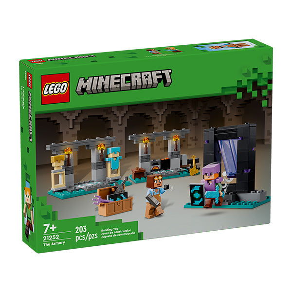 El set La Armería (21252) es un kit de construcción LEGO Minecraft diseñado para jugadores de Minecraft de 7 años o más. Este set ofrece a los niños y niñas la oportunidad de jugar en el mundo real con elementos y armas de Minecraft. Incluye dos figuras: la heroína de acción Minecraft Alex, con su escudo y espada de diamante, y el armero. El set consta de tres entornos diferentes para explorar: la zona de trabajo, que incluye un yunque, un horno, una piedra de afilar y un caldero lleno de lava; la sala de exhibición de armaduras, donde encontrarás un hacha dorada, un tridente encantado, una espada de netherita, un casco y otros recursos de Minecraft; y el portal del Nether, con una entrada de puertas batientes que lleva a una nueva aventura para los jugadores. Este juguete LEGO Minecraft se puede combinar con otros sets LEGO Minecraft, como La Trampa del Portal del Nether (21255), que se venden por separado, para expandir y enriquecer la experiencia de juego en el mundo de Minecraft.