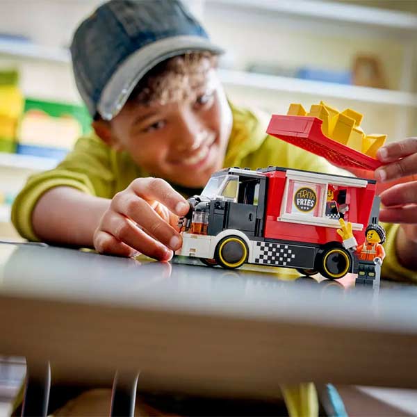 ¡Recorre LEGO® City en el fantástico Camión de Papas Fritas! Estaciónalo en el mejor lugar del barrio y pásate al área de cocina. Enciende la freidora, abre la ventanilla y sirve la comida rápida más popular de la ciudad en tu fantástico puesto, que parece una canastilla gigante de papas fritas. ¡La comida callejera nunca se ha visto tan deliciosa! Cuando termines, ¡avanza al siguiente lugar!