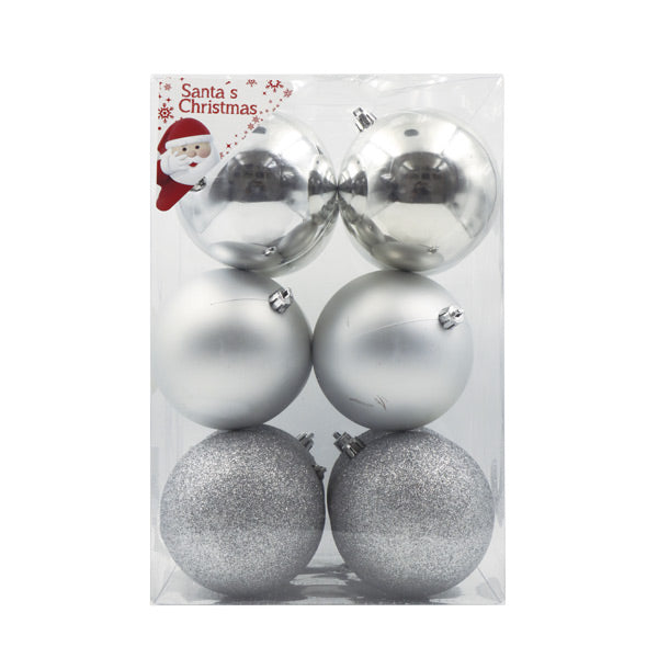 Esferas de Navidad plateadas de 10 cm en caja de 12 unidades. Cada esfera incluye una tapa y una cuerda, facilitando su colgado en las puntas del árbol. Solo saca las esferas y cuélgalas para una decoración instantánea y elegante. Perfectas para añadir un toque brillante y festivo a tu árbol de Navidad.