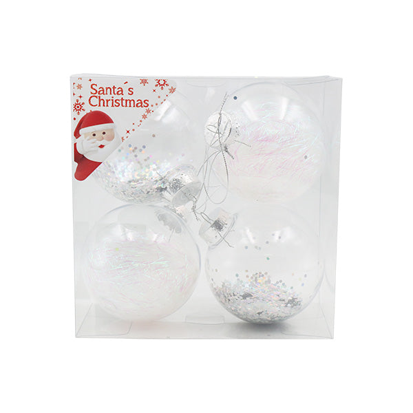 Esferas de Navidad plateadas de 10 cm en caja de 4 unidades. Cada esfera incluye una tapa y una cuerda, facilitando su colgado en las puntas del árbol. Solo saca las esferas y cuélgalas para una decoración instantánea y elegante. Perfectas para añadir un toque brillante y festivo a tu árbol de Navidad.